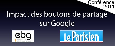 Informations Lieu de l’événement : EBG (Electronic Business Group) Date : 20 octobre 2011 Thème : Impact des boutons de partage sur Google Objectifs : Déterminer si les interactions sociales des principaux réseaux (Facebook, Twitter) ont un...